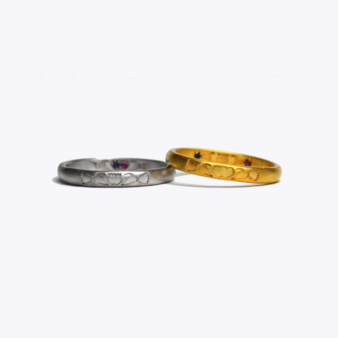写真左の指輪は腕の幅は3.0㎜で、お二人の誕生石をイメージしてφ1.3㎜のルビーとサファイアを留めています。