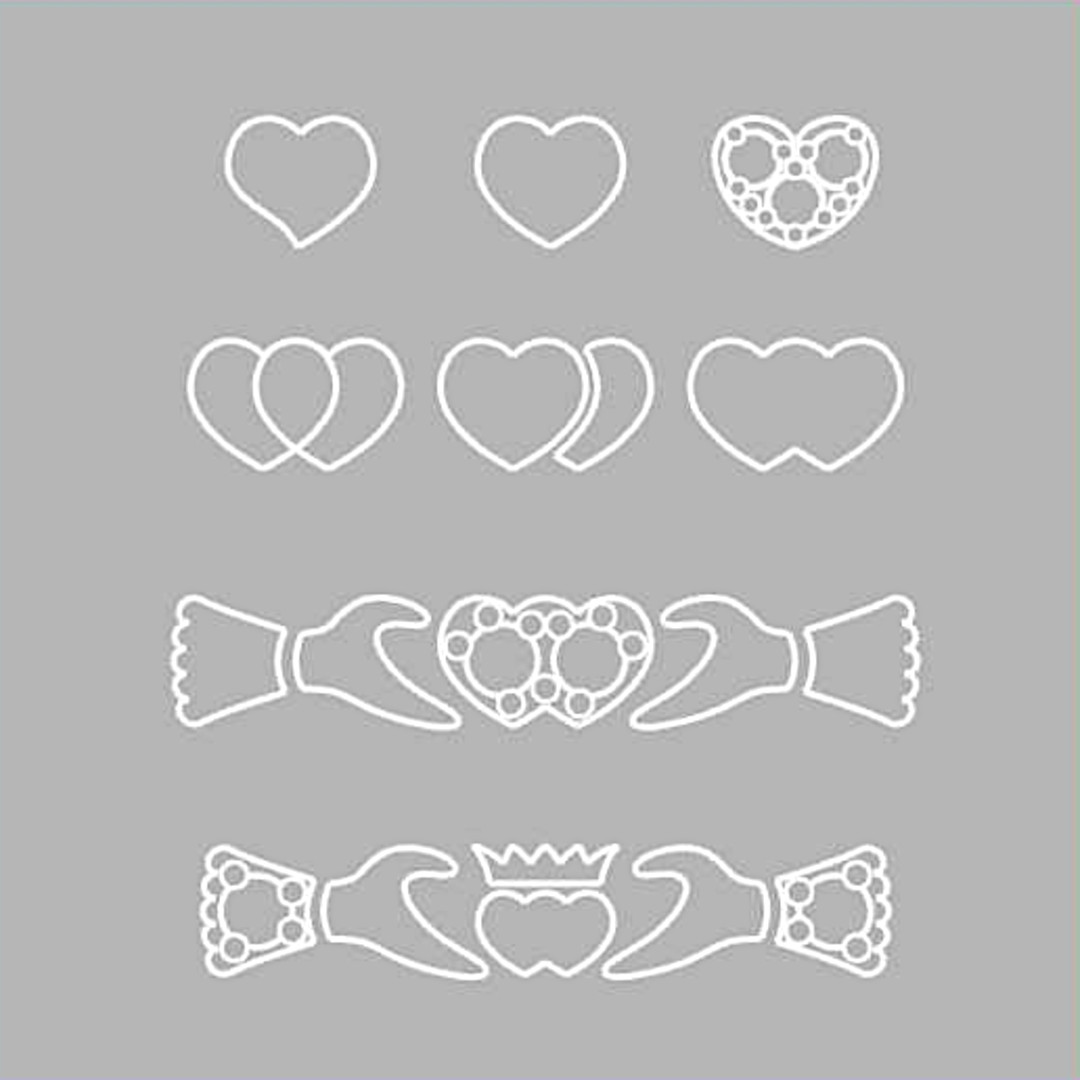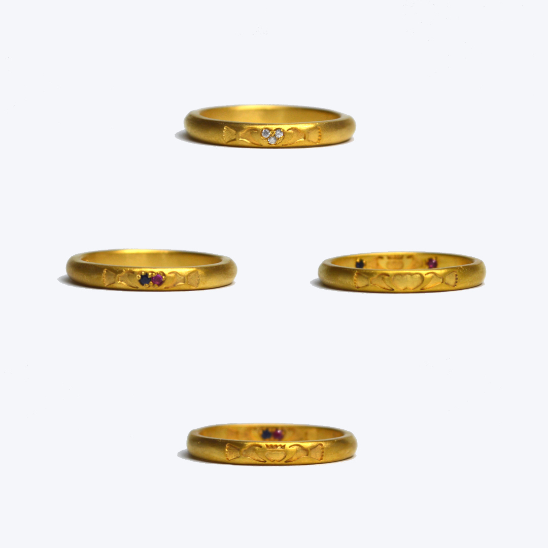 見本のように外側は宝石無しのダブルハート模様で、内側にお二人の誕生石を入れたダブルハート模様にするのもおすすめです。