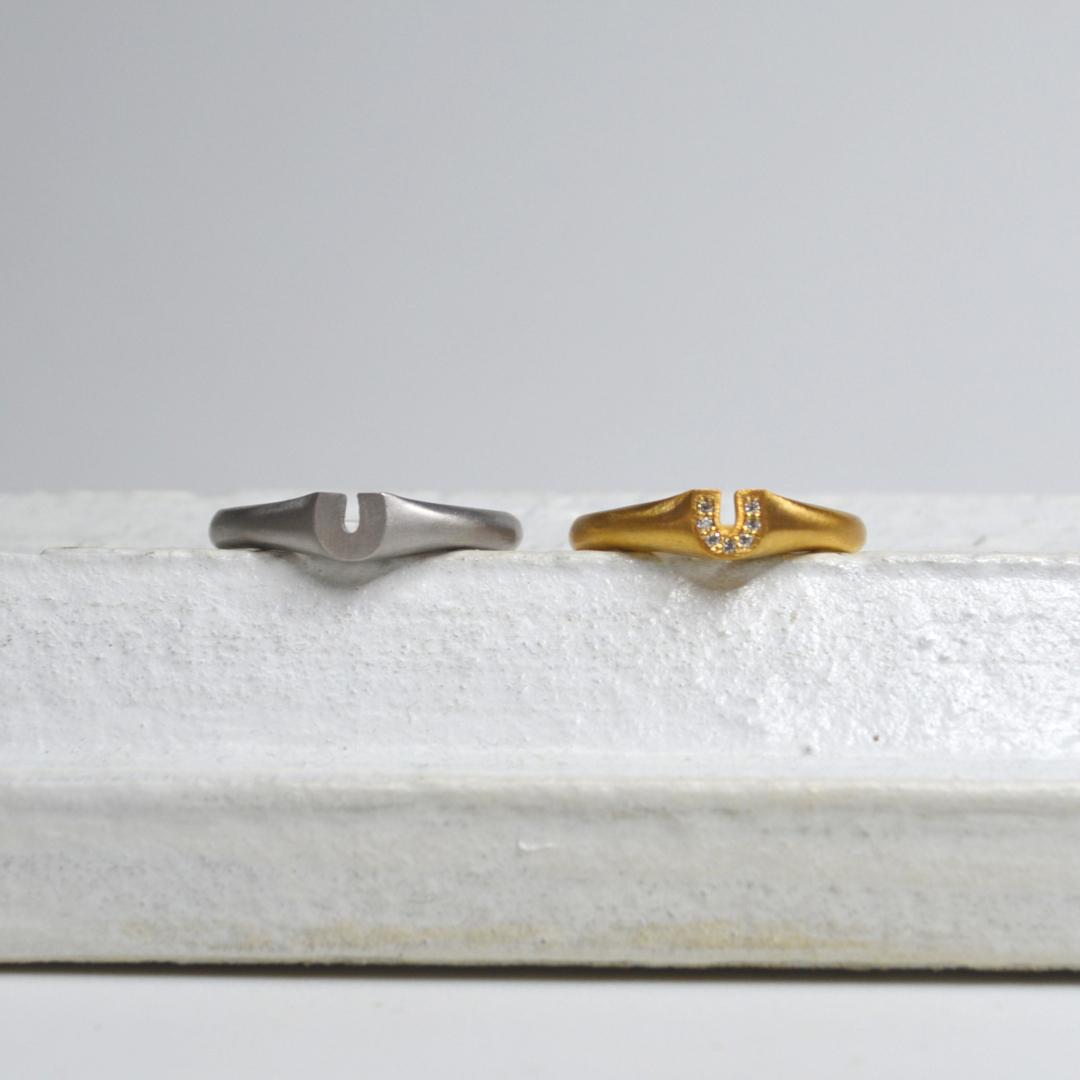 ジュエリーモチーフとして定番のホースシューを印台リングをベースにして作りました。レディースには直径1㎜のメレが7ピース留まっています。
