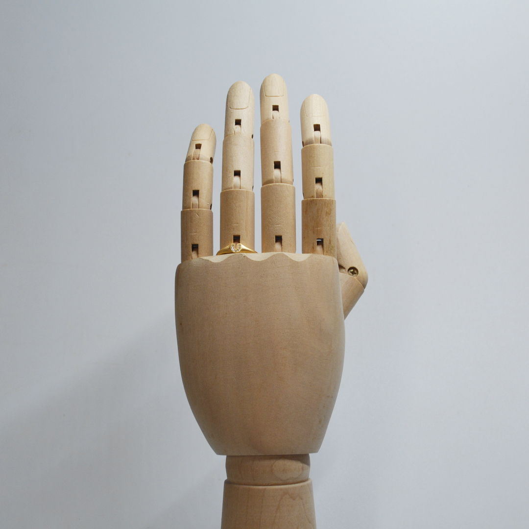 馬蹄パーツが開いた状態で指の根本に入れ、閉じる事で指輪がくるくる回ることを防ぎます。