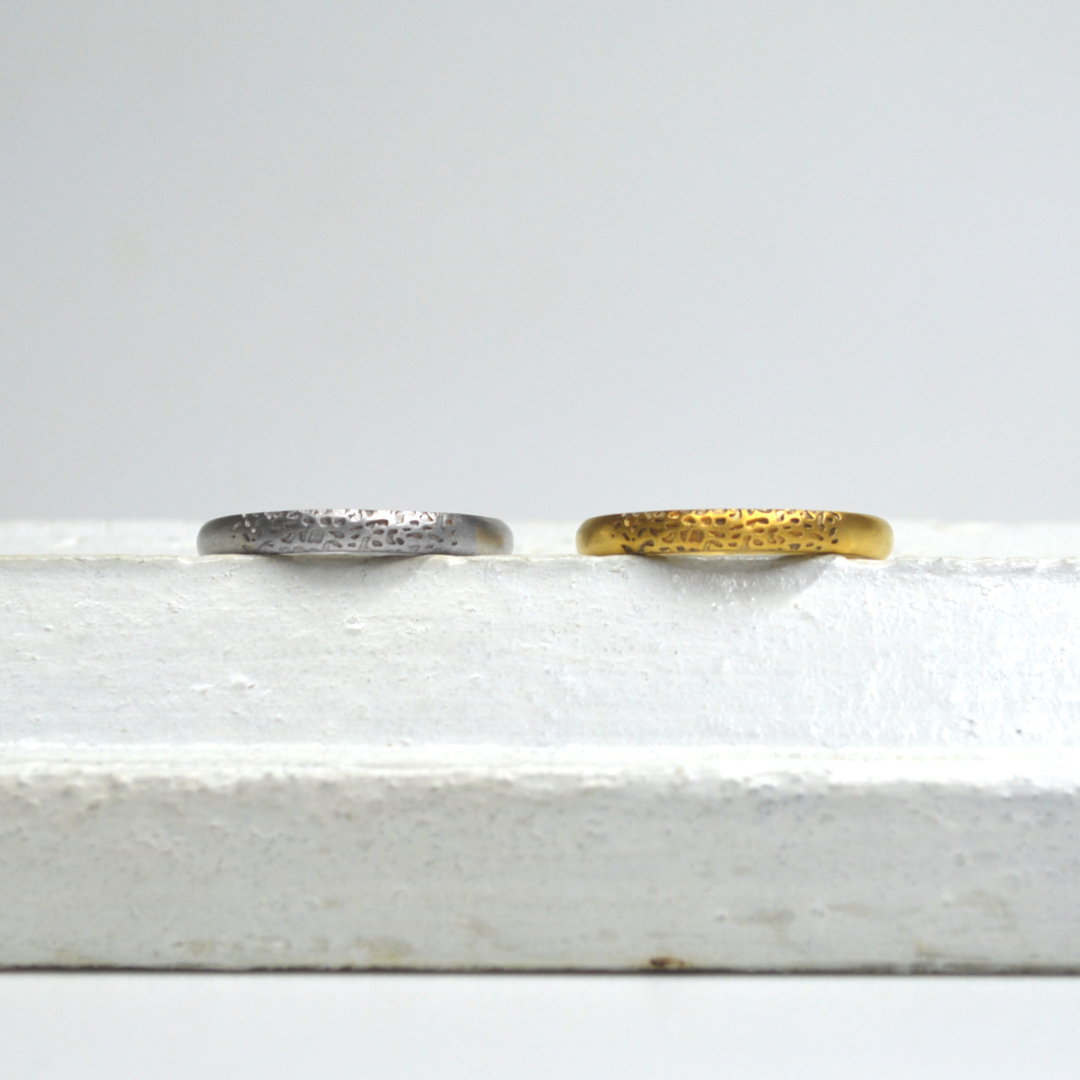 この2本を重ねると鼻紋が現れるシークレットデザインはレーザーの印字が可能な甲丸や平打ちなどシンプルな形状のみとなります。