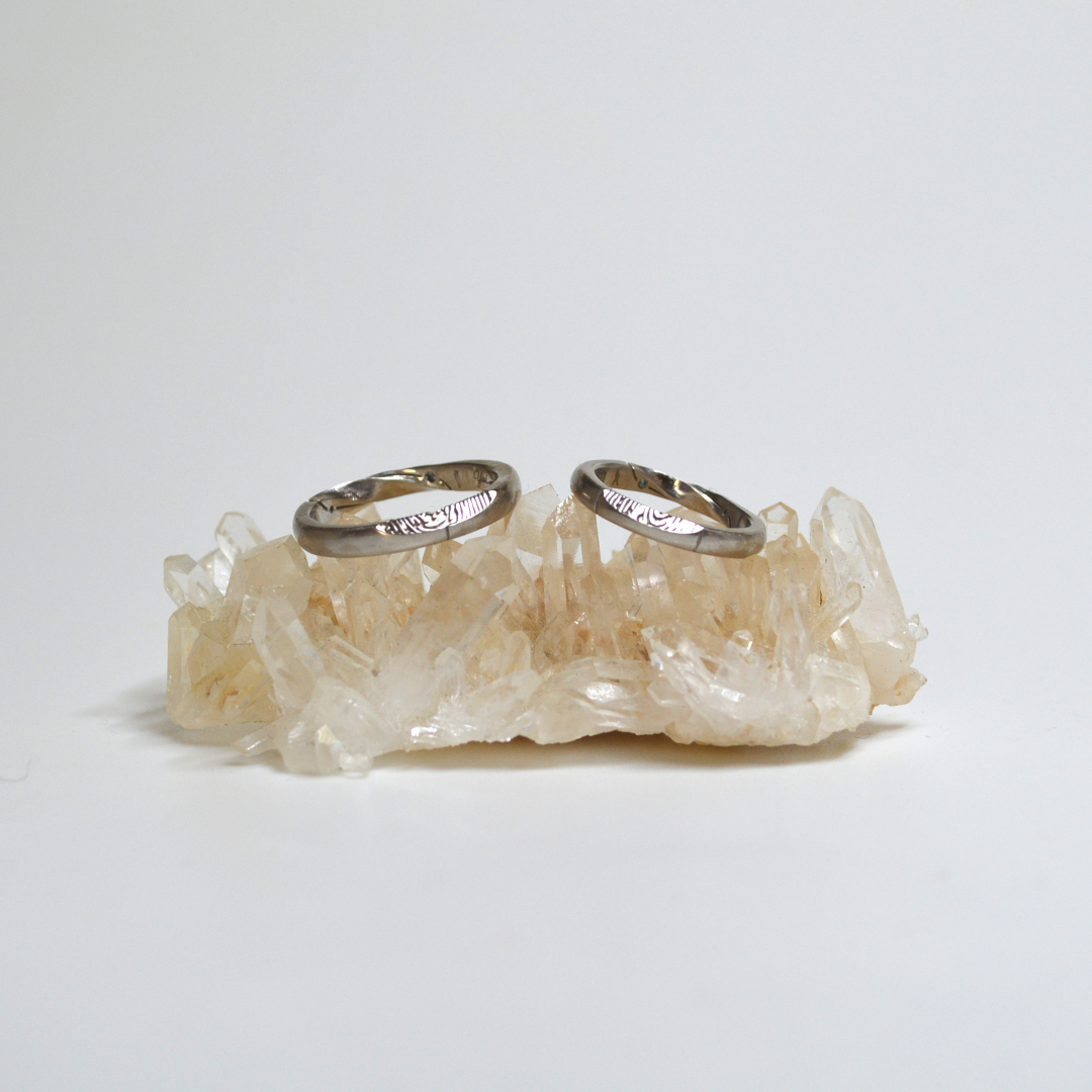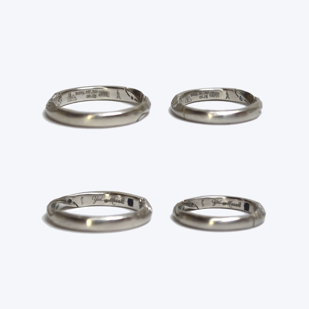 正面にお互いの指紋とイニシャル、背面に180度捻りと槌目模様を入れた結婚指輪をお作りしました。