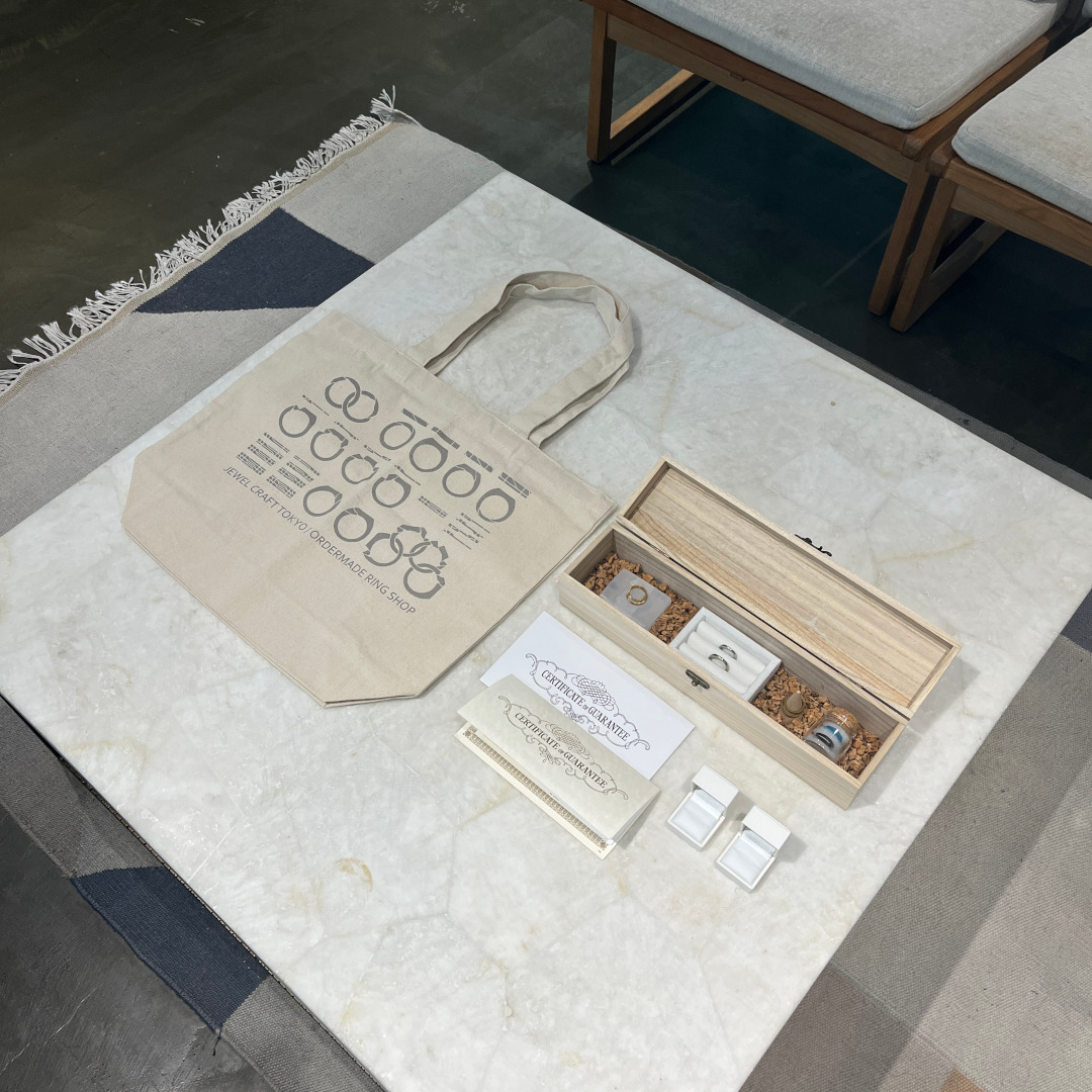 打合せではこのサンプルリングを見ながら幅、素材、仕上げなどデザインの詳細を順番に決めていきます。